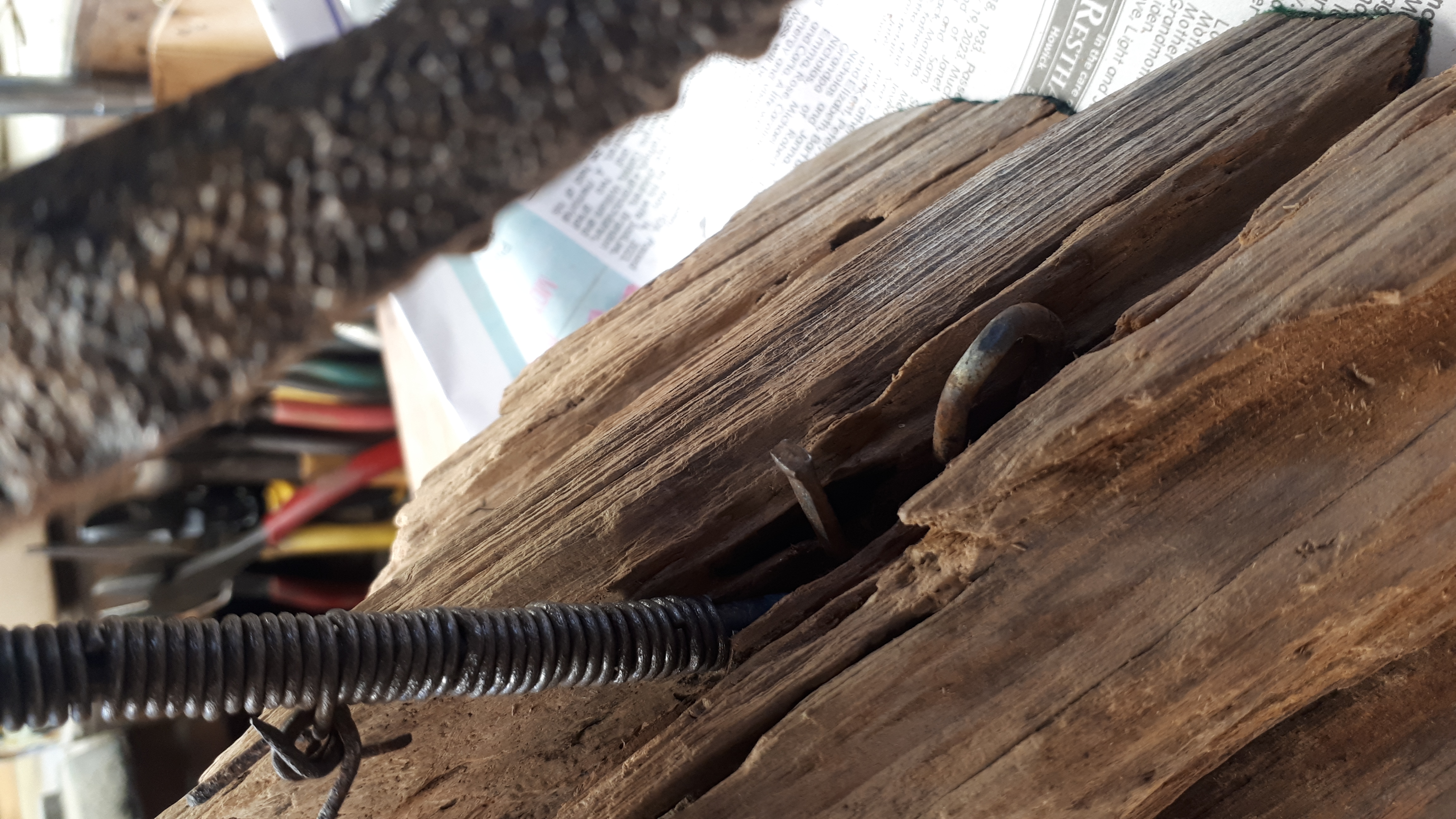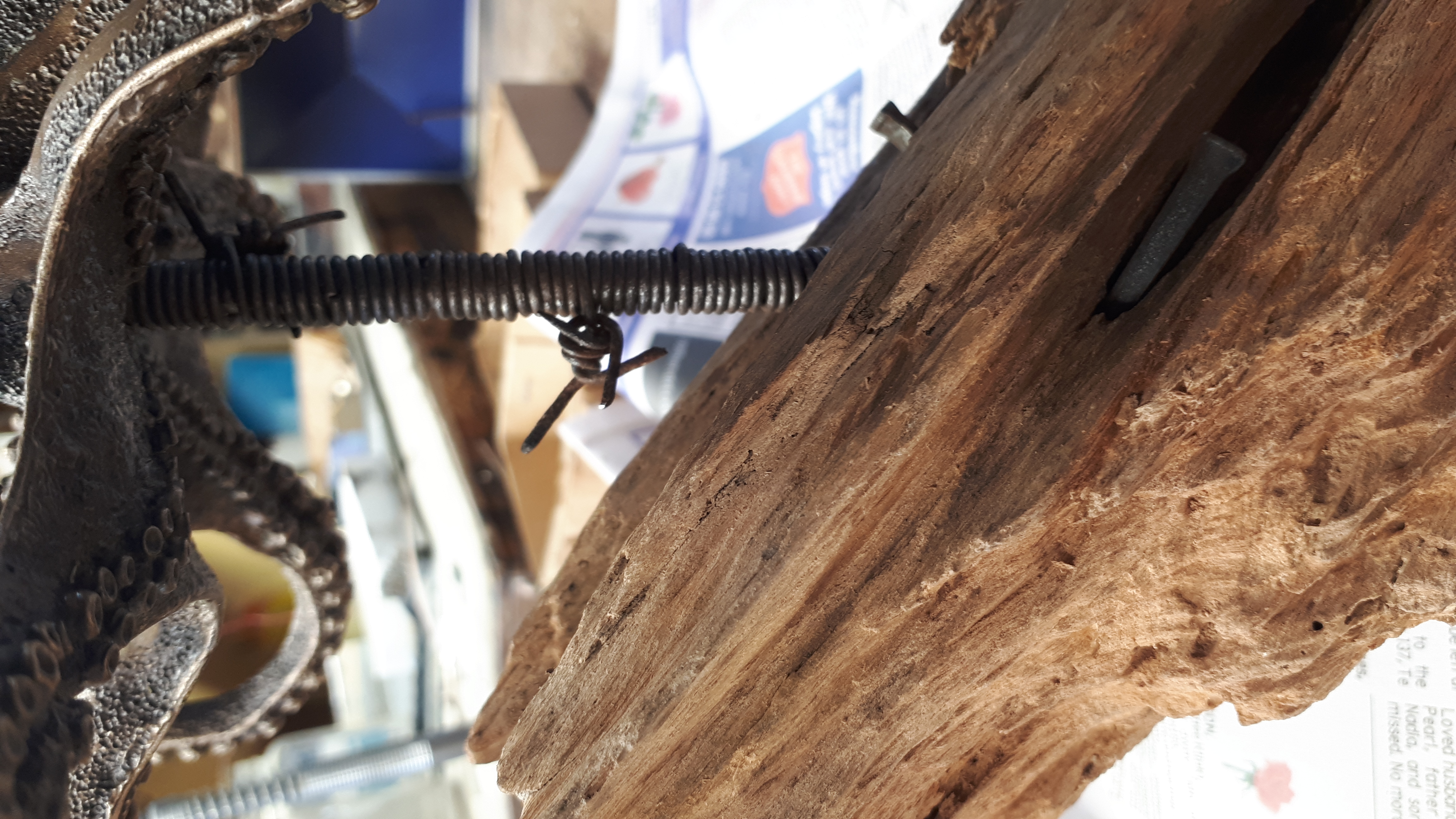Mounted on Totara and has the support shaft wrapped in loose rusty barbed wire